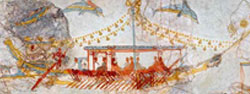 Since the Cycladic period several pictorial evidences and shipwreck attested a large development of ships used both as men’o’war and merchantmen. These early Aegean ship were characterized by a lean long design and a long vertical bow with symbols mounted on top (see illustration 2). In the Greek mainland ships with the typical curved ram on the bow, are attested since the Middle Helladic period. Because of the intensive commercial trade between the Aegean population and the Near Eastern Kingdoms, some of the early Aegean ships show similarities in general shape and design with the Egyptian ships of the same period, as well attested in pottery representation and in the famous fresco from Akrotiri in the Thera island dated around 1600 BC. (see illustration 3).